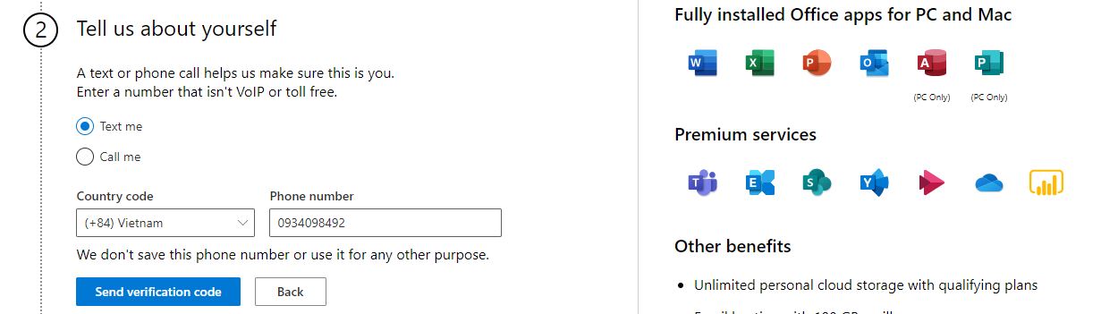 6 – Chọn xác thực bằng hình thức Text me, nhập số mobile phone của bạn, chọn Send virification code, hệ thống sẽ gửi về mã xác thực qua số điện thoại khai báo, kiểm tra tin nhắn và nhập mã Code từ Microsoft gửi đến. Chọn Verify
