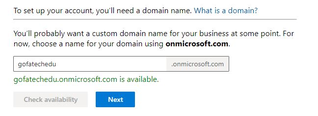 6 –  Lưu ý trong phần Create your business identity, nhập vào domain của công ty bạn, tên domain có dạng tendoanhnghiep.onmicrosoft.com. Sau đó chọn Next