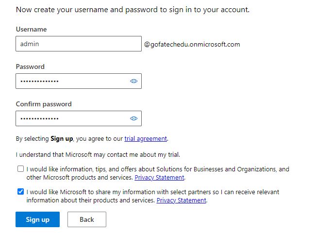 7 – Tạo tài khoản quản trị cho dịch vụ Microsoft 365. Đây là tài khoản đầu tiên cũng là tài khoản sử dụng đăng nhập vào hệ thống Microsoft 365 gói E5. Sau khi khai báo thông tin tài khoản chọn Sign Up