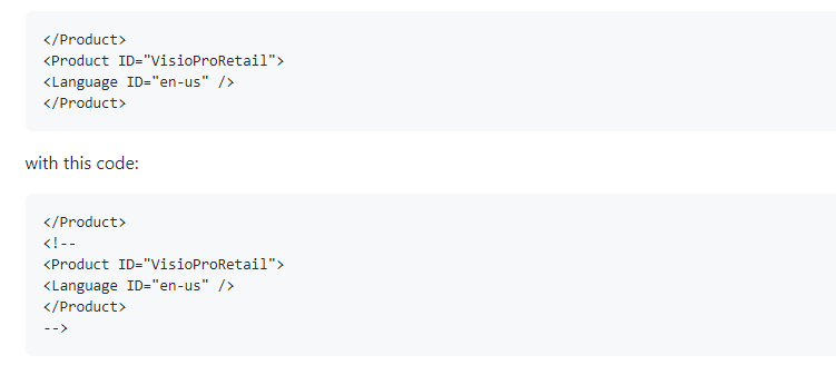 <Add SourcePath=”\\LON-CL1\OfficeProPlus\” OfficeClientEdition=”32″ Channel=”Targeted”>