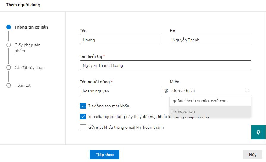 • Đối với trường hợp Microsoft 365 có nhiều miền cần chọn đúng miền cần khởi tạo cho người dùng.