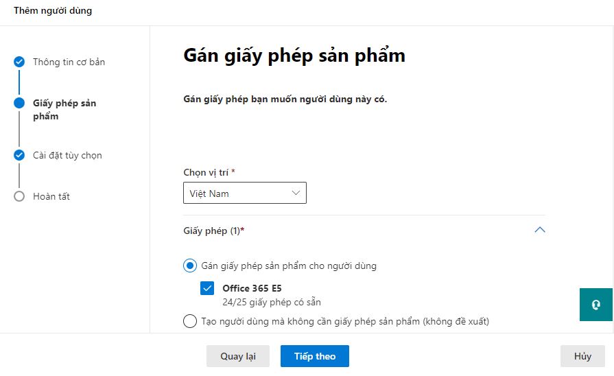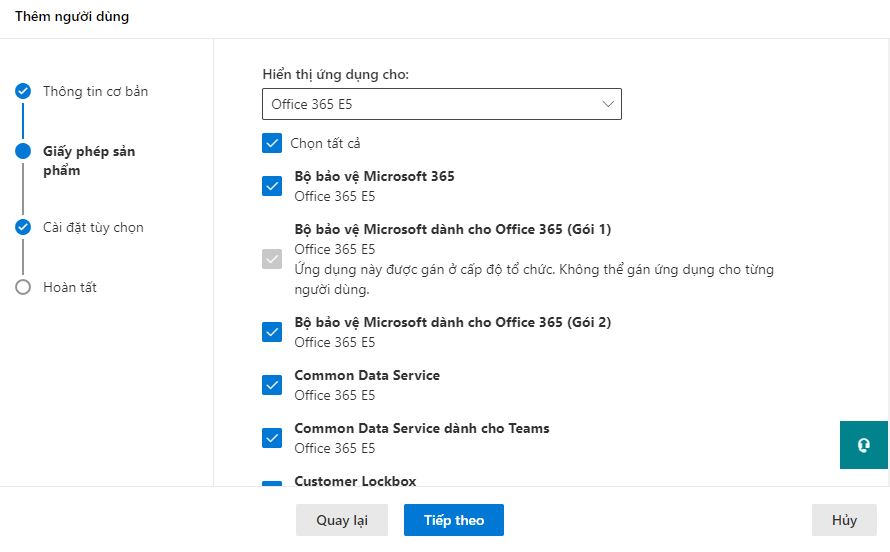 1 – Tại giao diện gán giấy phép có thể chọn các giấy phép sản phẩm khác nhau cho người dùng khi đăng ký dịch vụ. Tuỳ vào nhu cầu sử dụng của user trong doanh nghiệp và cấu hình giấy phép sau cho phù hợp.