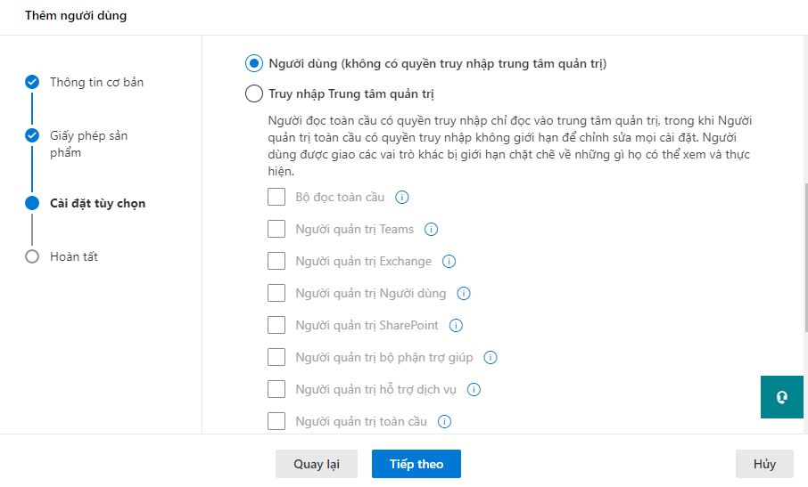 Chỉ thực hiện gán vai trò cho người dùng với những vị trí quản trị đặt biệt, trường hợp chỉ là người dùng cơ bản trong hệ thống để mặc định và chọn [Tiếp theo]